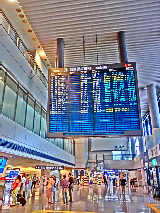 「時刻表」 飛行機の離着陸時間を知らせる縦型の電光掲示板。