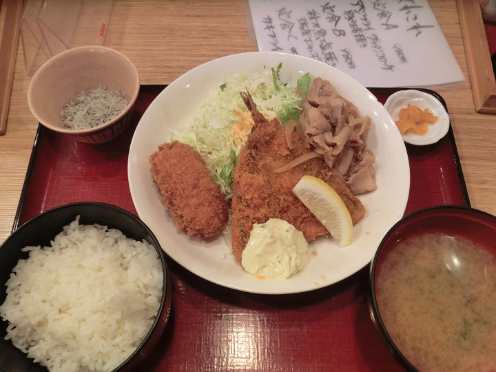 アジフライ+クリームコロッケ+生姜焼き の定食